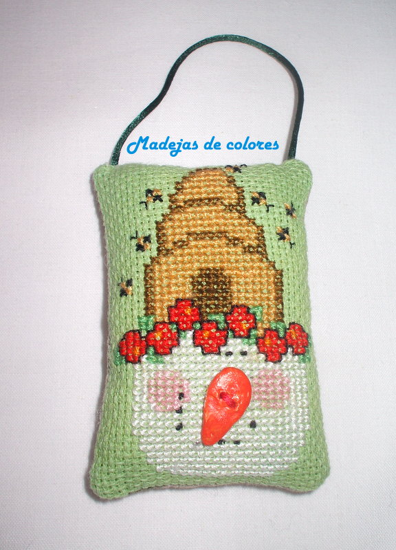 Y para finalizar, un detalle de Navidad con tela teñida de verde por mí, lo mismo que la zanahoria de la nariz, hecha con pasta. Le bordé un simpático muñeco de nieve.