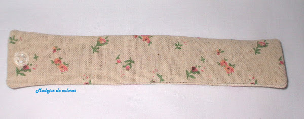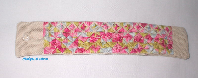 Esta es la pulsera, la tela sólo se ve en los extremos pues está casi toda bordada. En la foto no conseguí que saliera los tonos reales, son más suaves.