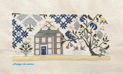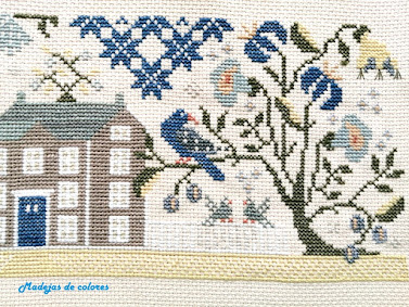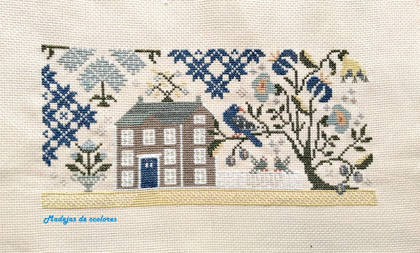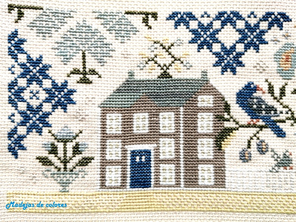 Este año su petición fue hacer a punto de cruz en estilo primitive y fondo tostado, un cuadro para tapar la tapa del contador de la luz. El diseño que escogí, eso si que es sorpresa fue "Indigo Lane" de WTNT.