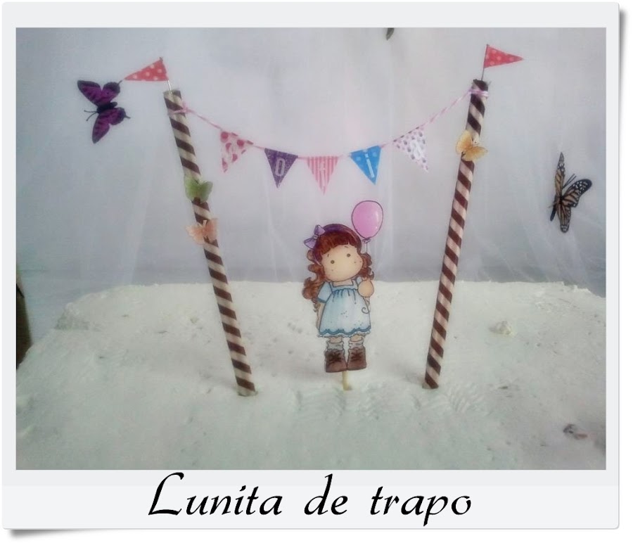 Como quien no quiere la cosa, han pasado 2 añitos del nacimiento de mi hija y como no toca fiesta, lo que conlleva hacer invitaciones, decoración (en mi familia somos de fiestas temáticas), menú para la mini Candy vamos un montón de cosas, como toda la fiesta lleva un montón de decoración quise que la tarta llevara también algo hecho por mi y me animé a colorear una muñequita y hacer unas banderillas a juego.