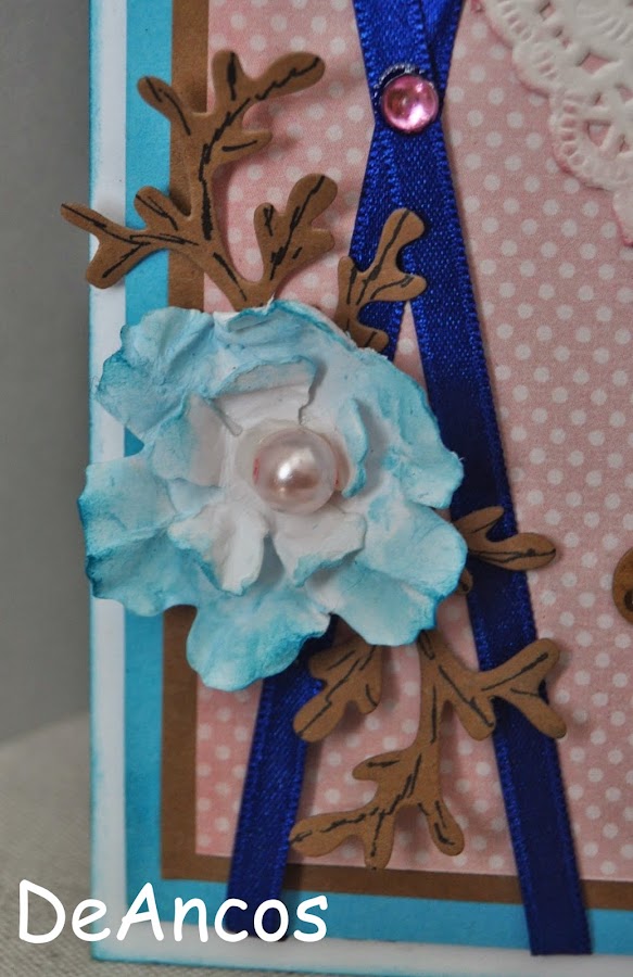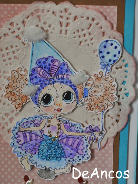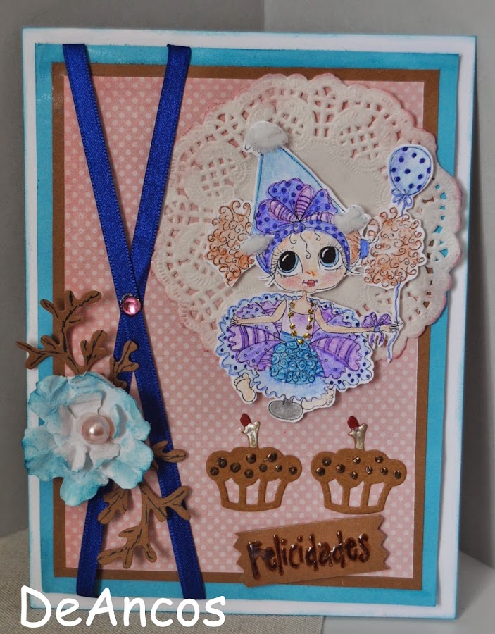 La sugerencia era hacer una tarjeta de felicitación y yo la he realizado para una niña que dentro de poco cumplirá 11 añitos. Un trabajo en el que he combinado el marrón con el azul y el rosa, además de los tonos malvas de la muñequita festiva que he coloreado por pinturas acuarelables.