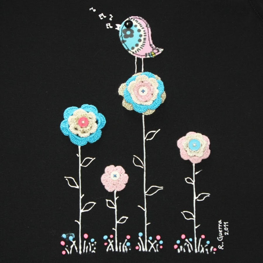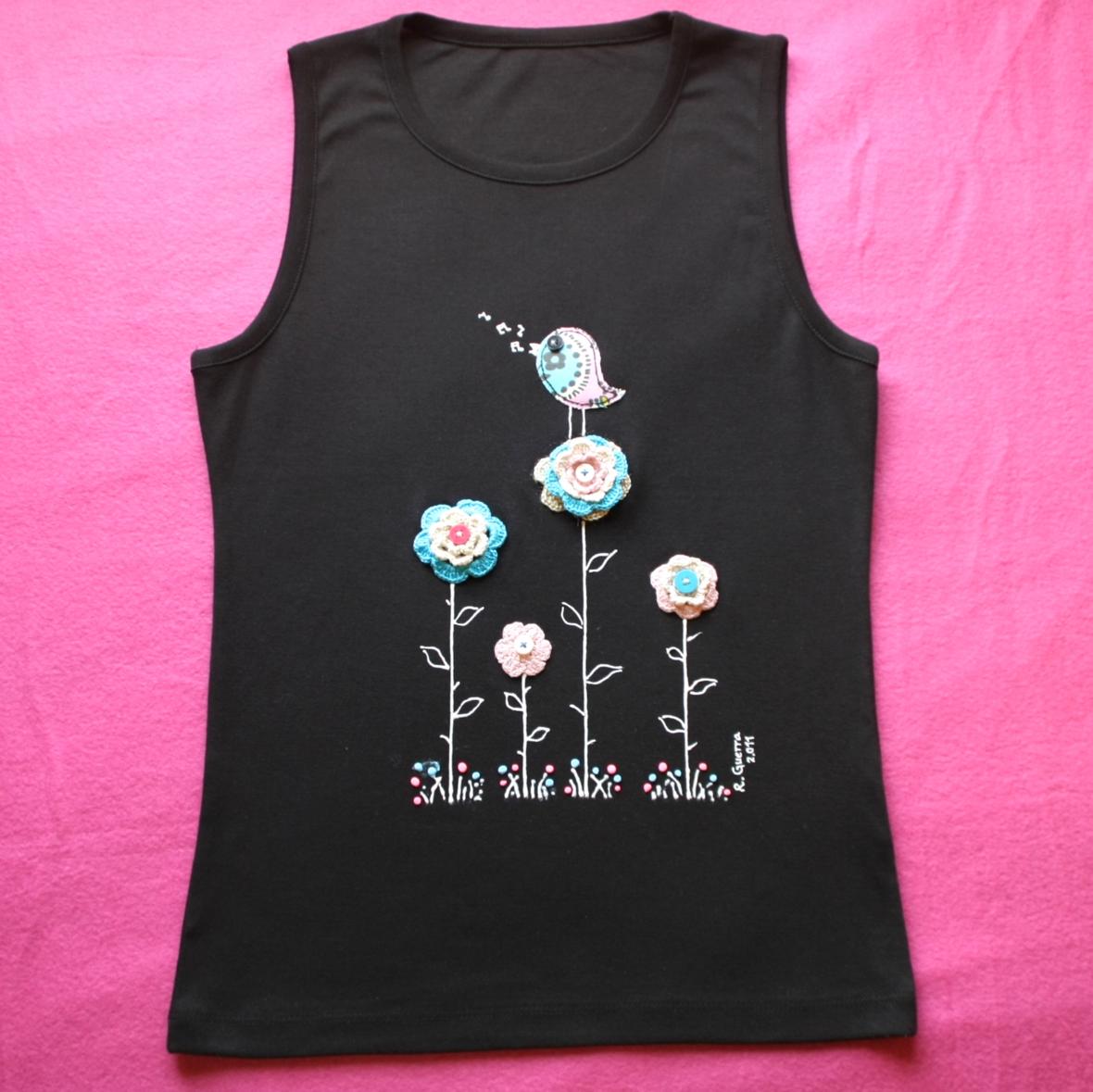 CAMISETA "OBSERVANDO DESDE LAS FLORES" DETALLE DE DIBUJO DETALLE DE PÁJARO DE TELA