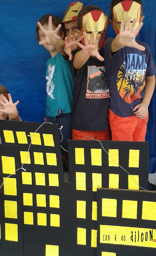 To complete the mask idea, I did a photocall with cardboards painted like a city and blue sky.
