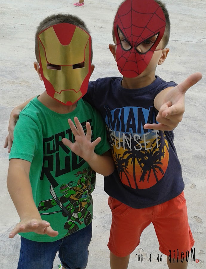 Spiderman la verdad que fue fácil para mí, solo tuve que recortar las máscaras y hacer los detalles con rotulador negro.Ironman me llevó más tiempo (y, no está bien que yo lo diga ¡pero triunfó!) --> Igual y fue porque este superhéroe ataca con la mano abierta, como diciendo que tiene 5 años y era lo que más pegaba en el cumple, jeje.