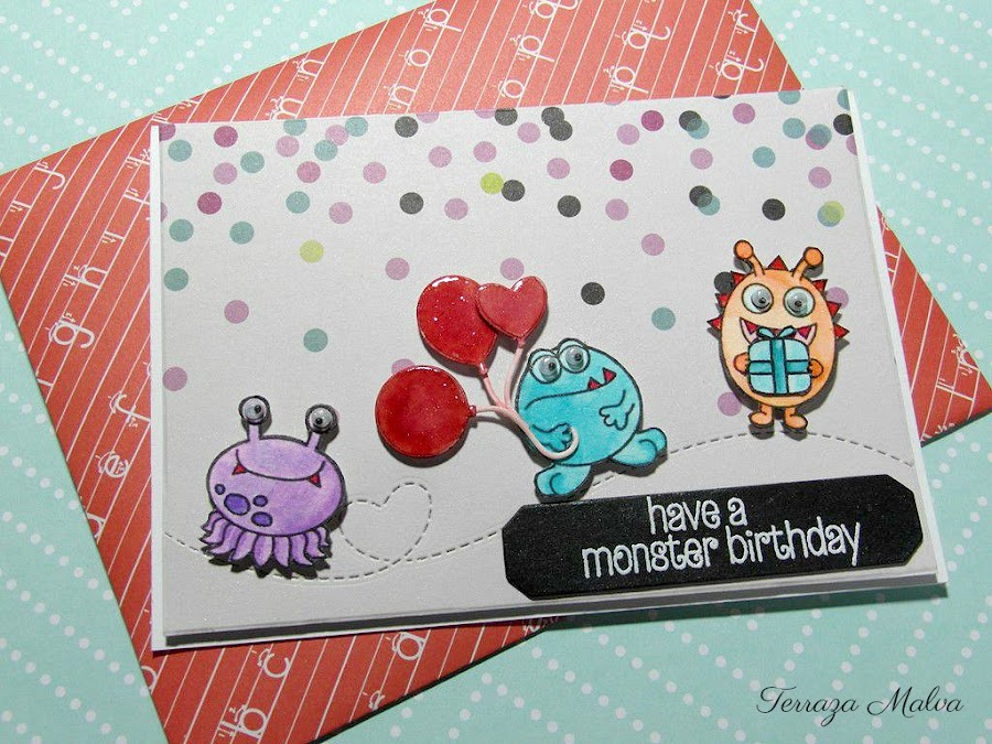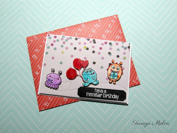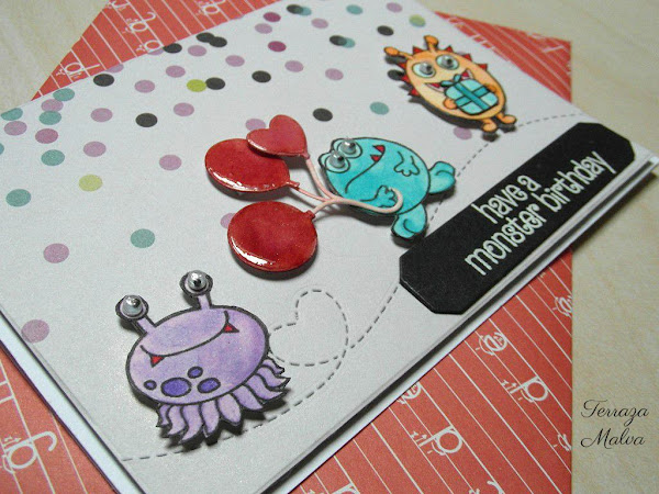 Los monstruitos están estampados sobre papel acuarela de Canson y los he coloreado con mis rotuladores acuarelables preferidos, los de Kuretake. Con los ojitos móviles he dado a las figuras un toque divertido. Están situados siguiendo la trayectoria de uno de los troqueles del set "Stitched trails" de Lawn Fawn.