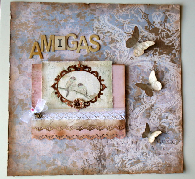 Mi colaboración fue esta lámina, con un papel de fondo precioso, en el que ,aunque no se aprecia mucho, tiene un relieve de terciopelo en los arabescos muy bonito...