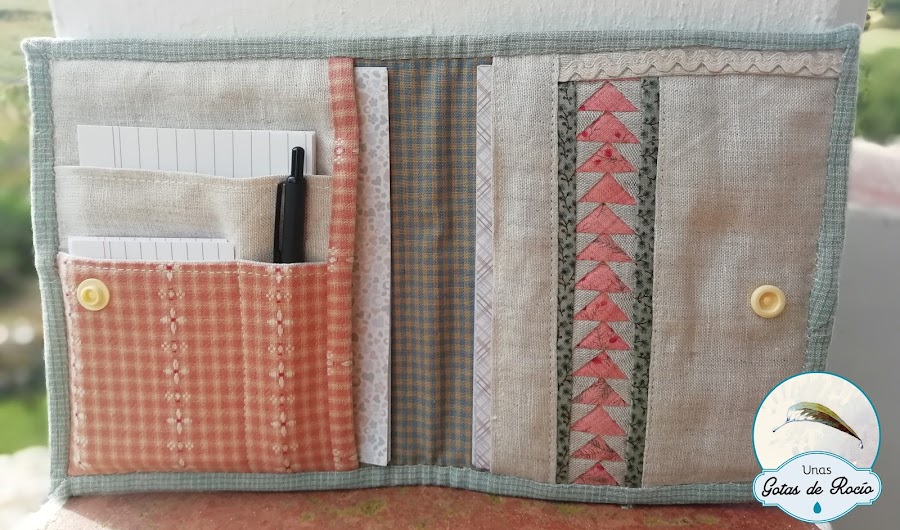 Ha sido un trabajo muy entretenido de hacer, en el sentido de diversión y de meticulosidad. Desde buscar en tiendas el mini bolígrafo, las fichas y los papeles, hasta diseñar la carpeta y preparar los materiales para su confección. El vuelo de la oca de su interior, el meshwork, el bies de remate, el cierre interno... Todo ha sido pensado y ejecutado con detalle. Muchísimas felicidades María José, y gracias por todo.