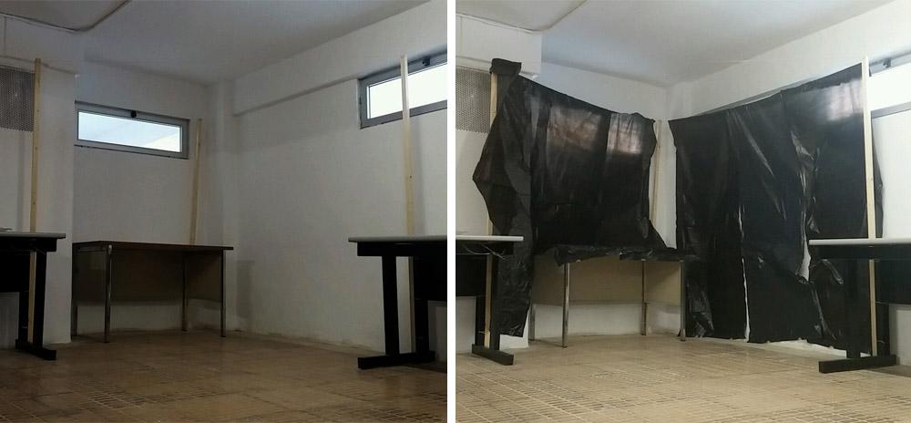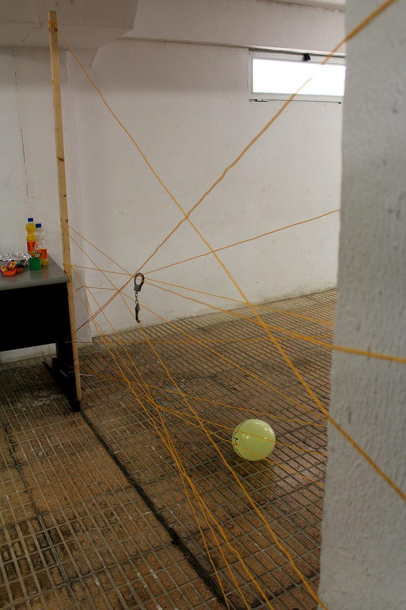 El espacio donde realizamos los cumpleaños, es un espacio común del edificio donde vivimos, así que lo de hacer agujeros en las paredes esta descartado, por eso sujetamos nuestros listones de madera con bridas a unas mesas que hay en el espacio, como veis en las imágenes.
