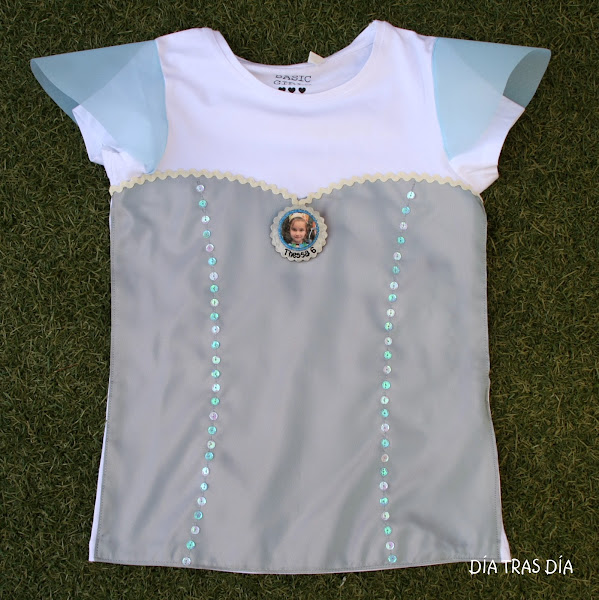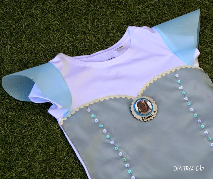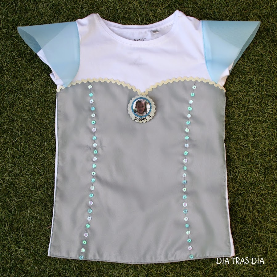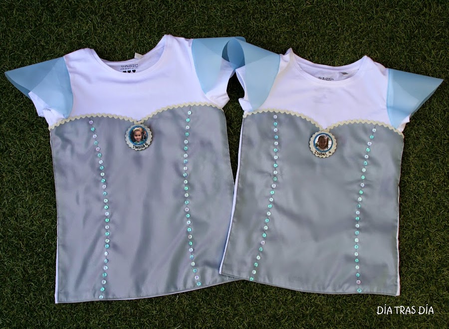 Pero no han sido como en las anteriores ocasiones camisetas que fuesen decoradas con dibujos a juego con el tema elegido. En esta ocasión, Clelia me pidió que si podía transformar unas camisetas para que se pareciesen al vestido que luce la princesa Elsaen la película.