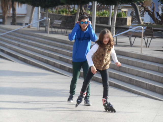 la peque disfrutando de sus patines nuevos, ha tenido muchos regalines, super sand de repostería, troqueles, sellos,