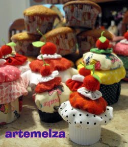 Para fazer o mini cupcake, utilize uma tampinha de refrigerante como base, faça o fuxico, cole com cola quente e enfeite-o ao seu gosto.
