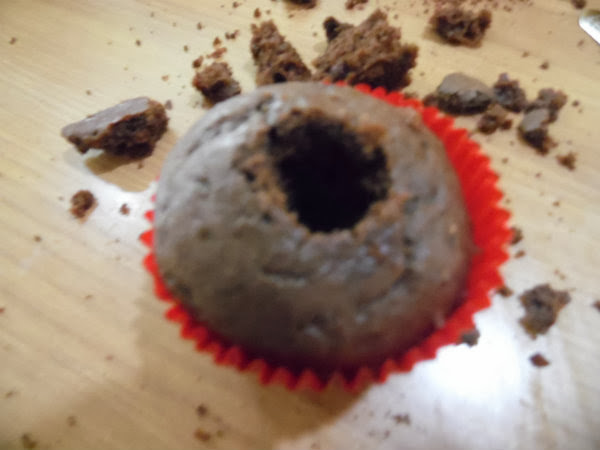 Una vez el relleno y los cupcakes estén fríos con la ayuda de una pequeña cuchara o un cuchillo hacemos un orificio en el centro del cupcake donde introduciremos el relleno con ayuda de una grulla o una cuchara.