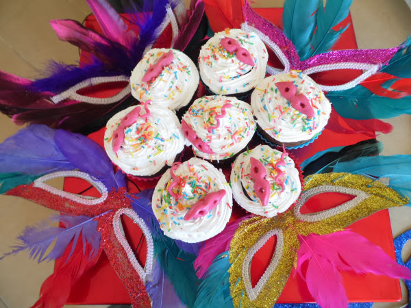 Debo decirles que me hace mucha ilusión esta entrada y poder participar en el concurso Carnaval en la Mesa porque resulto ser algo muy creativo. Durante días estuve tratando de pensar en algo que representara el carnaval o al menos que hiciera alusión a ello, la verdad es que yo no lo celebro ni estoy muy familiarizada con este tema así que literalmente fue todo un reto. Al final decidí hacer cupcakes con una máscara y chochitos de colores que creo que representan bien la alegría de estas festividades. Espero que les gusten: