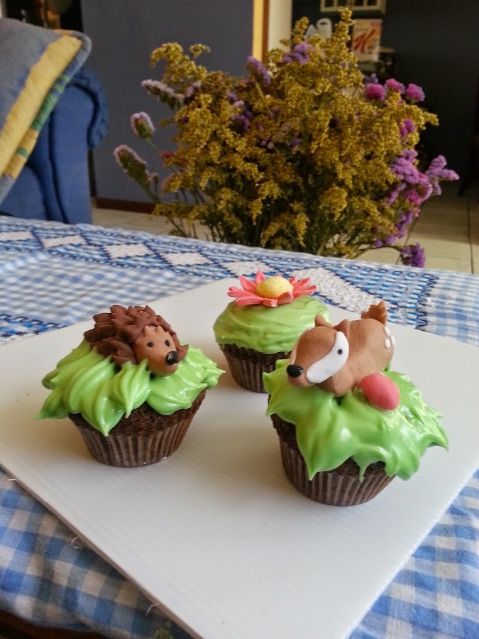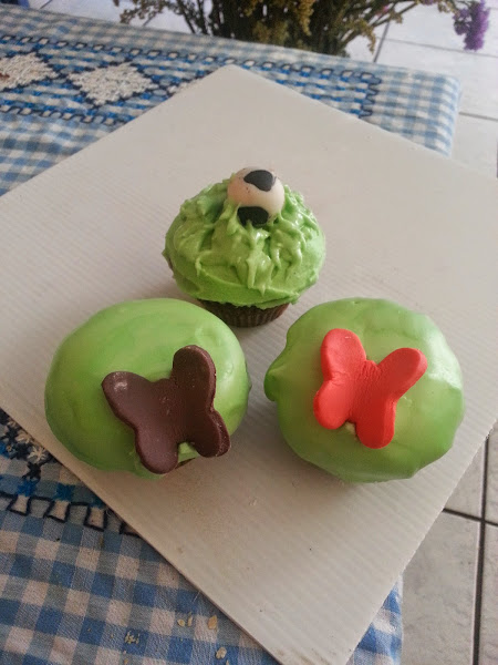 Más cupcakes de chocolate con glasé real! y animalitos, la flor es de otro molde que conseguí, es un set de tres gerberas Cupcakes de chocolate con glasé real, las mariposas están hechas con un cortador de galleta en forma de mariposa y la bola de fútbol es... bueno una bola blanca con pedacitos negros a la que le seguí dando forma hasta que el negro se fusionó con el blanco