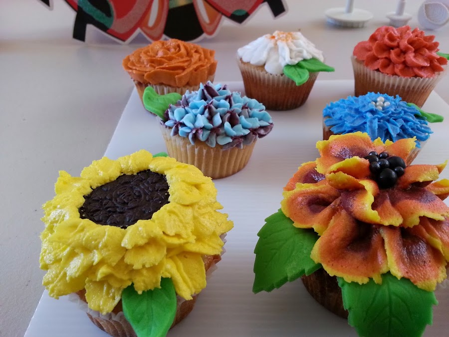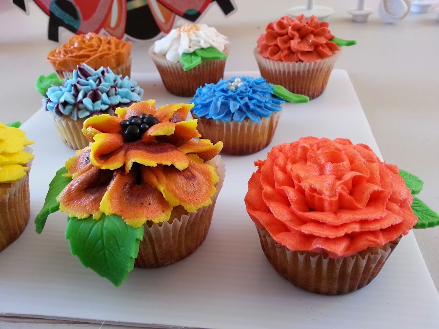 Estos son de vainilla, pero no los hornee yo. Las flores sí las hice yo, pertenecen al curso de flores de lustre que llevé hace un par de semanas. Las flores están hechas con buttercream y son de izquierda atrás hasta adelante derecha: rosa, margarita, crisamento, hortensia, gerbera o dalia (la que sea más parecida), girasol, begonia y rosa curvada.