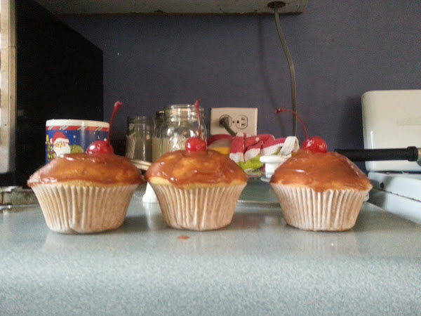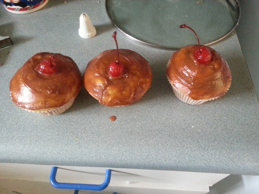 Para la decoración, es la decoración más simple que se me ocurrió y que he hecho en realidad, lo único fue pasarles un poco de dulce de leche y les puse una de esas cerecitas que venden en tarritos pequeños de conserva :) le añade un toque especial. Aunque me pareció que capaz y desentonaba un poquitíto! pero igual se ve rico :)