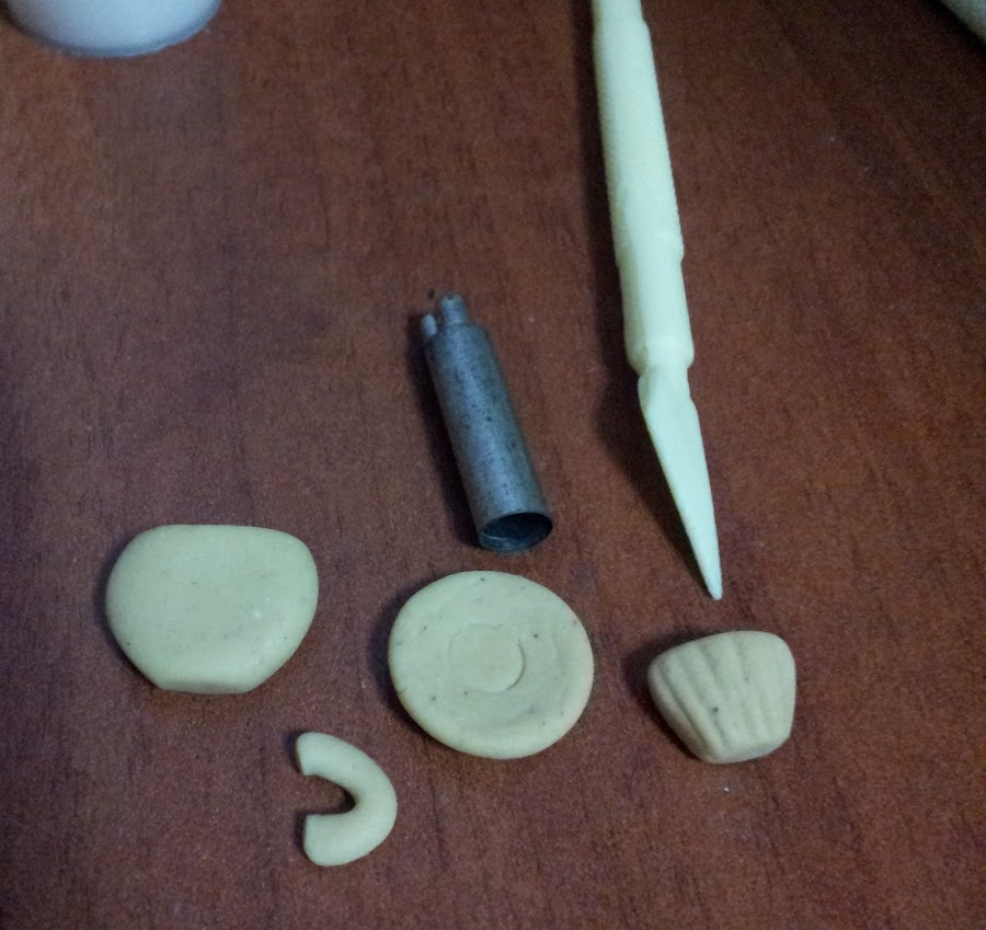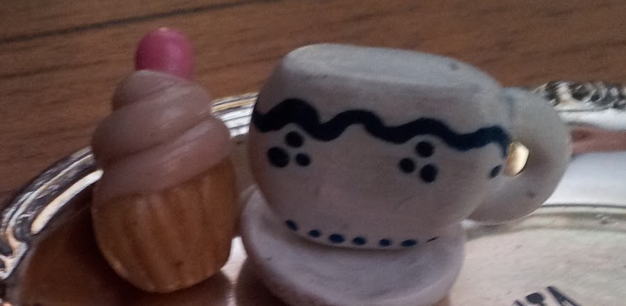 La pequeña tacita y plato los realicé en porcelana fría sobrante de otro trabajo, después de estar seca la pinté en color blanco y le dibuje unos pequeños detalles en azul.