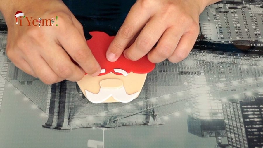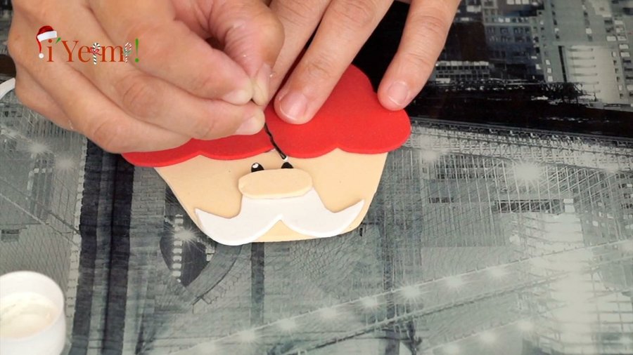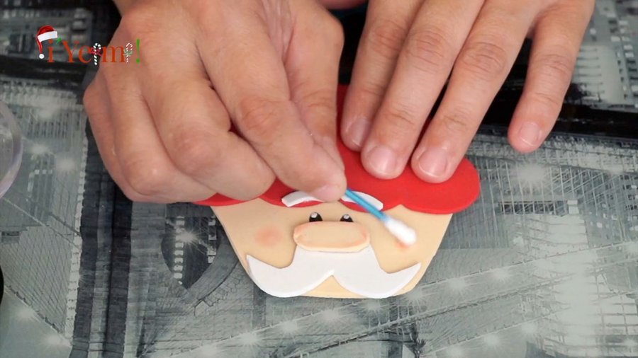 Para el santa claus, pegaremos los bigotes y la nariz sobre esto, dibujamos los ojos con el marcador negro y sobre esto aplicamos una gota de la pintura acrílica blanca, pegamos las cejas sobre la espuma roja estas las cortas al tamaño que prefieras y pegamos el pompón blanco en la punta de la espuma.
