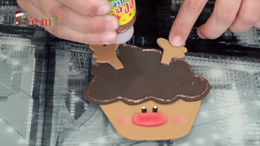 En el caso del reno pega la nariz, los cuernos van en la espuma por el frente que se norte que son los cuernos y repite los primeros pasos para la decoración.
