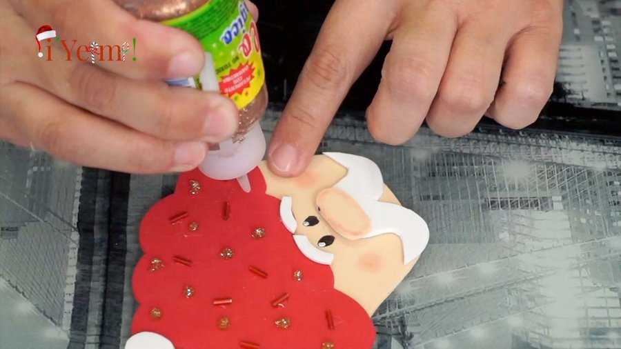 para decorar la espuma roja o el gorro utiliza el canutillo color rojo, asi como la pega diamantina dorado y cobre y dibuja el contorno del pompón blanco con la pega diamantina color plata.