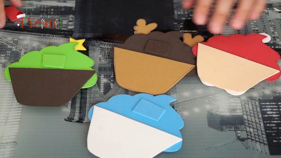 Pega el hilo justo en medio de la espuma y sobre esta coloca el cuadro que recortaste esto te servirá como apoyo, y listo!!! ya tenemos nuestros cupcake navideños.