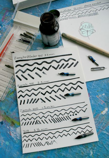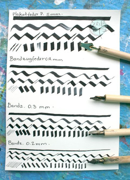 La "Zierschriftfeder": Plumilla para letras de adorno. Así se llama en alemán, es una plumilla con punta redondeada y con un aditivo/lengüeta que ayuda al almacenamiento de la tinta. Como ves yo la tengo en 4 tamaños diferentes, dependiendo del tamaño de su punta me da el grosor de su linea pero siempre es una linea constante, digamos "redondeada" da igual como yo mueva mi pluma, el trazo siempre será igual.