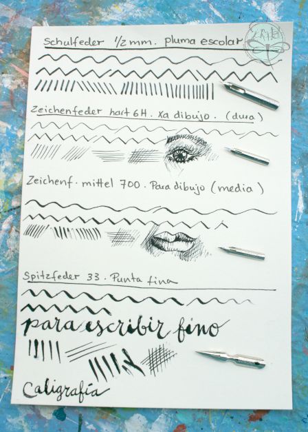 Luego tenemos las plumillas para dibujo (Zeichenfeder) Dependiendo de su modelo, aunque todas de punta fina, nos van a dar los trazos, desde trazos muy delgados (duros) a trazos más gruesos (medio/suave).