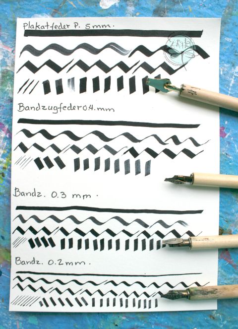 Las otras, son "Bandzugfedern": Plumillas planas (o de banda) Estas son las más conocidas, aptas para muchos tipos de escritura. Algunas tienen su punta plana y completamente recta, otras un poco biseladas hacia un lado o hacia el otro, dependiendo si son para diestros o zurdos. Son mis favoritas porque su trazo varía dando líneas gruesas y delgadas que logran unos efectos muy interesantes en las letras.