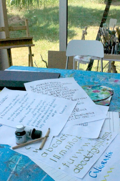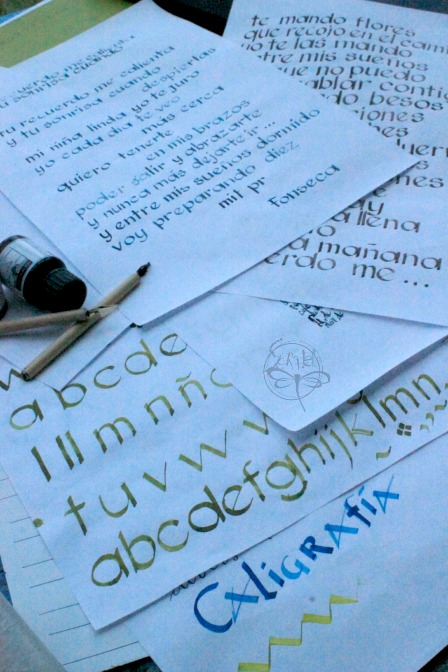 La lucha entre mi quiero y mi mano no me ayuda! entre mi cabecita tozuda y las vocecitas que gritan: No te queda bien!! la plumilla no corre, tengo que estar busque y busque tinta, estoy toda manchada los dedos... miér-coles por qué me metí en este rollo?
