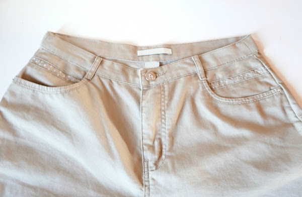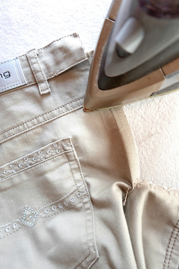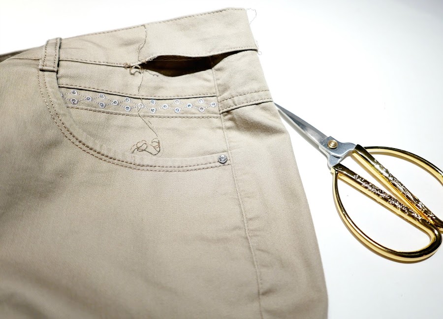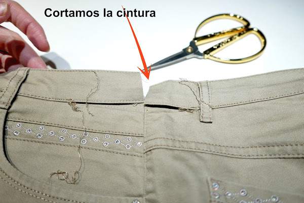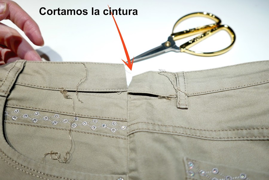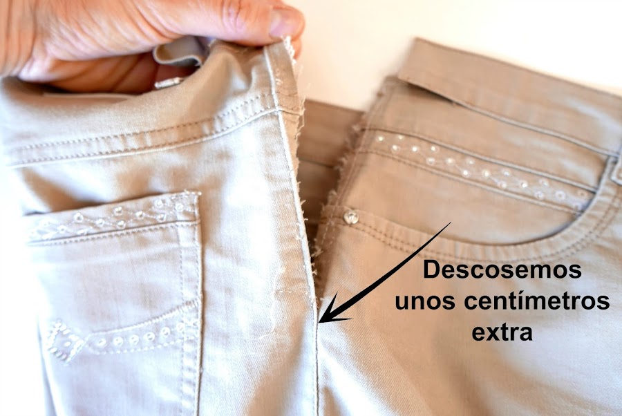 Empezamos por descoser la cintura del pantalón, sólo unos centímetros. Lo sificiente para que podamos trabajar, pero no mucho para así no tener que coserlo después.