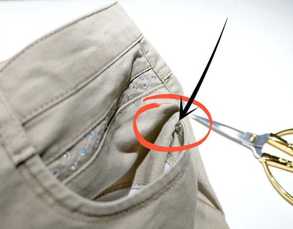 Importante: Debemos fijarnos si estas tachuelas toman todos los tejidos de la costura, o sólo el bolsillo y parte superior del delantero del pantalón, como sucede en este caso.