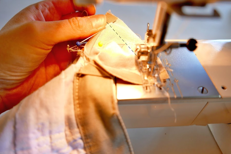 Consejo: Si tenemos que salvar el problema de tener la tachuela lateral entre la costura, podéis cambiar el prensatelas por uno de los que sólo tienen una pata y sirven para coser cremalleras.