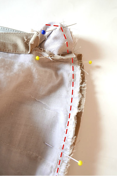 Ahora debemos ocuparnos de que la costura que acabamos de descoser quede lo más limpia posible de los hilos "antiguos" y además desplancharemos para que nos quede dispuesta para ser cosida de nuevo por donde vamos a estrechar.