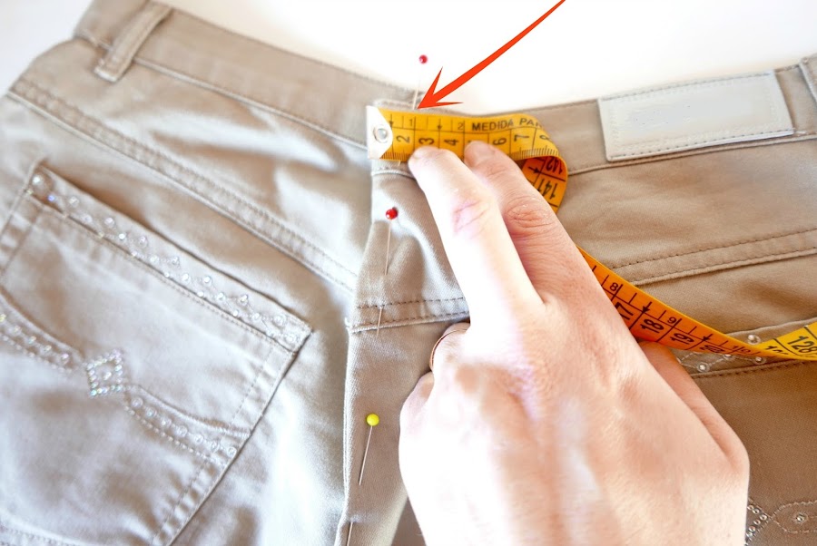 Lo mejor es que una vez determinado lo que necesitamos "quitar" al pantalón, Lo translademos a cada lateral del pantalón la mitad del total que nos sobra.