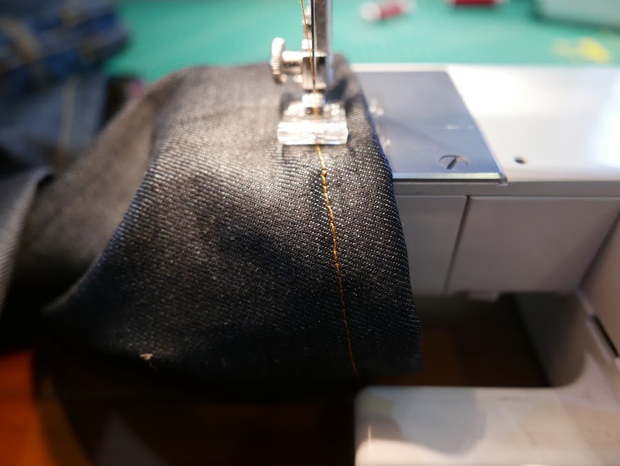 Antes de empezar es importante poner en la máquina la aguja apropiada para Jeans y el prensatelas que nos ayuda a que la máquina no se atasque en el tejido.