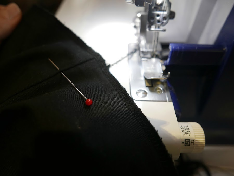 Ahora colocaremos alfileres perpendicularmente por todo alrededor del bajo y ya tendremos los bajos preparados para coser a máquina: