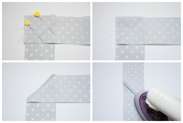 Para unir los distintos trozos de tela que has cortado para hacer la cinta, debes coser los extremos en diagonal y plancharlo como puedes ver en la foto. De esta forma se evita que quede la costura muy abultada cuando vayas a ponerlo.