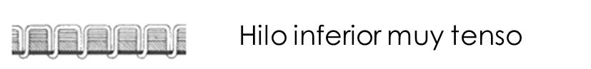 En este caso el hilo inferior está demasiado tenso y tira del superior hacia abajo. Verás que el hilo blanco sale por el revés de la tela. Para corregirlo debemos aumentar el valor de la rueda tensora.