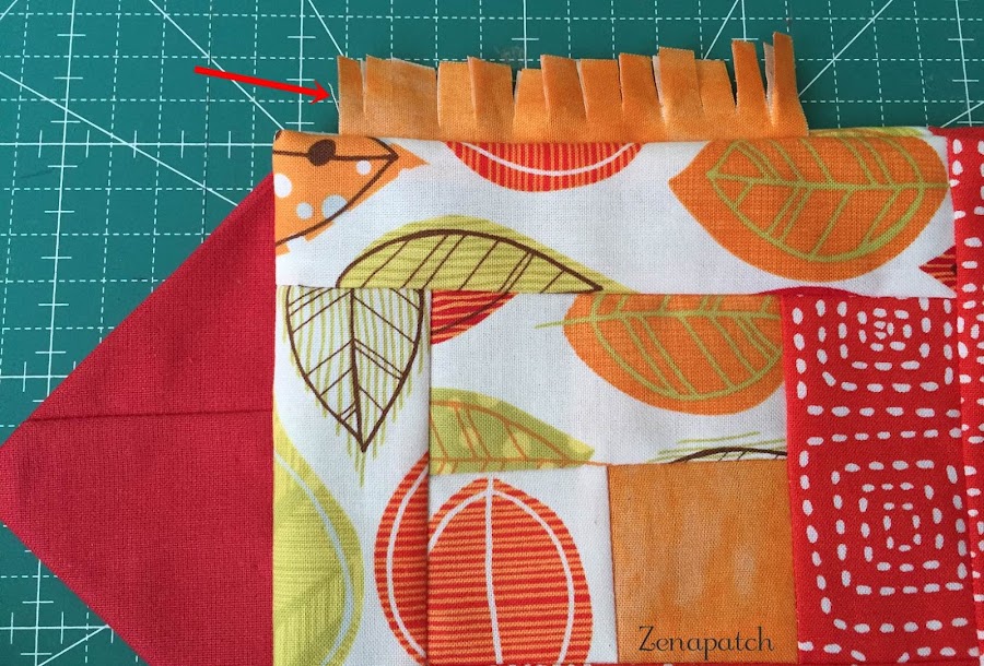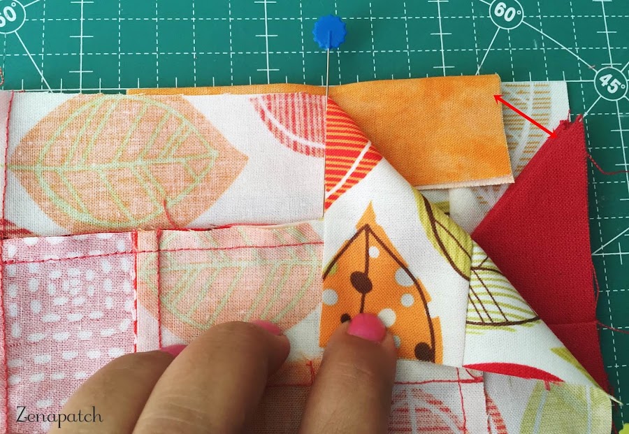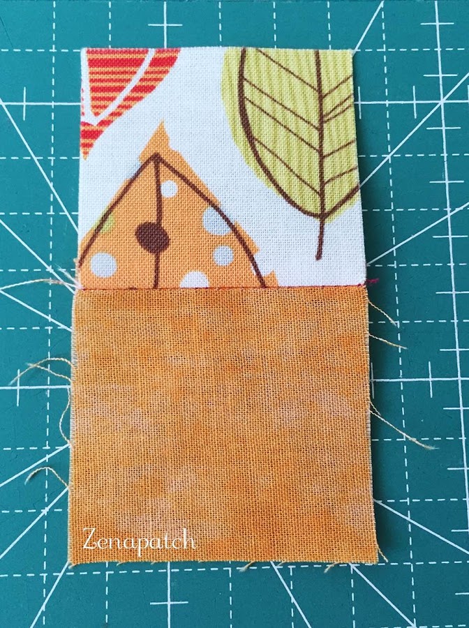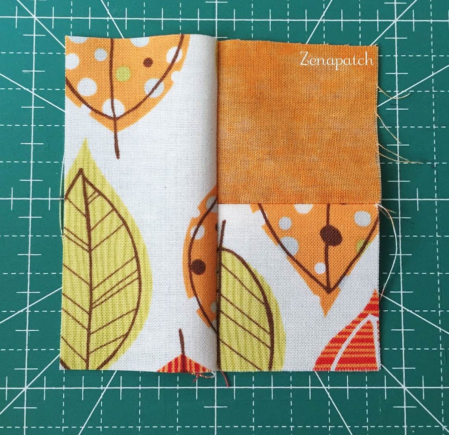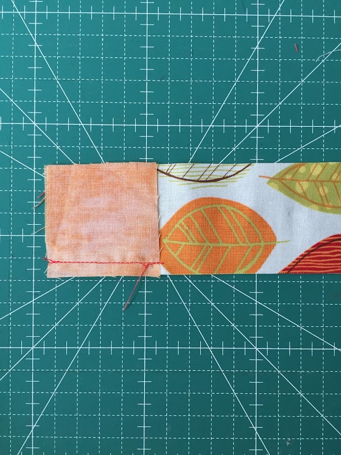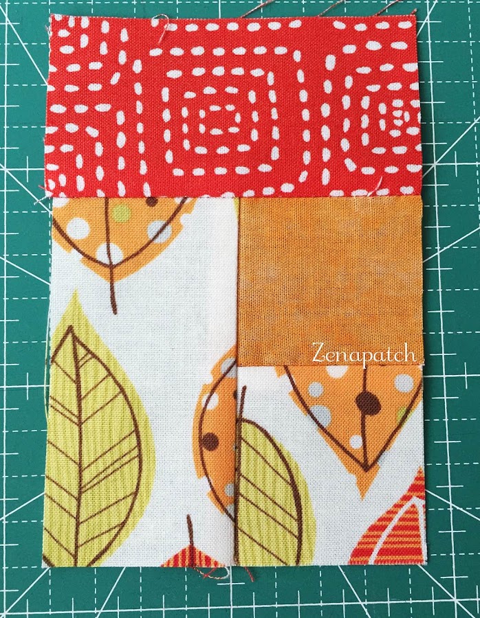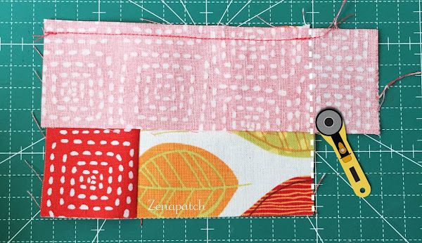 Toca coser a la derecha, 5 bloques de 5 - 2 cm (1 cm en la costura rojo-naranja y otro centímetro en la naranja-estampado) .. tenemos que cortar una tira de 13cm.