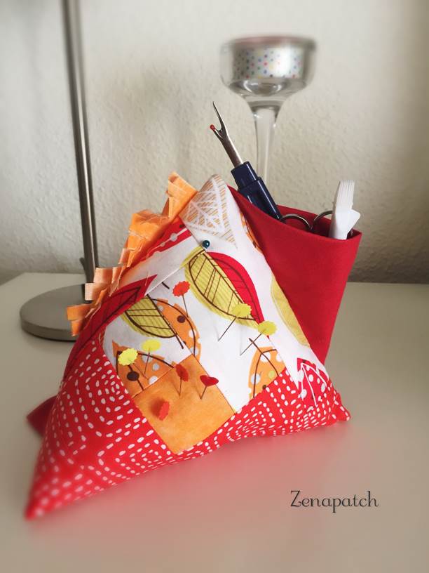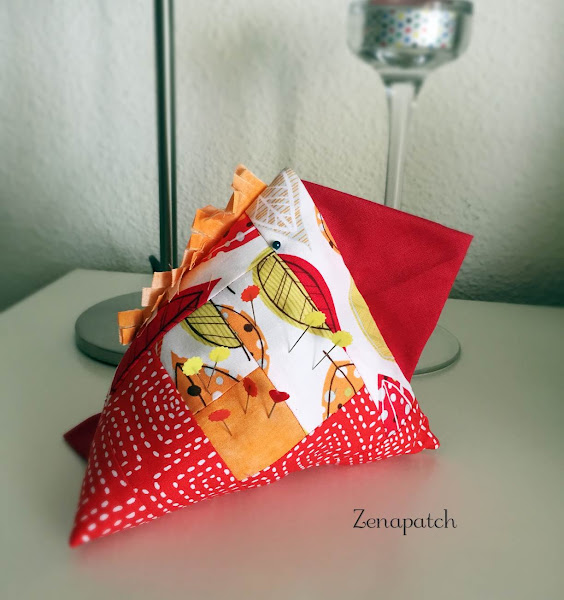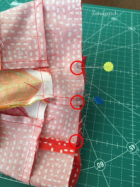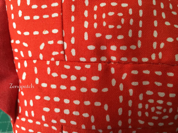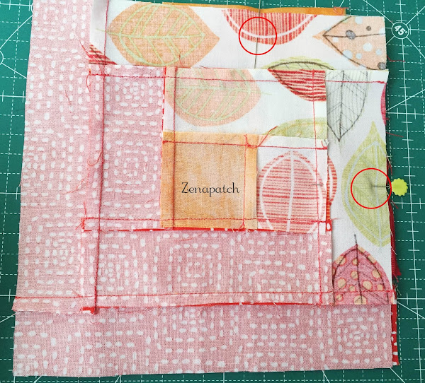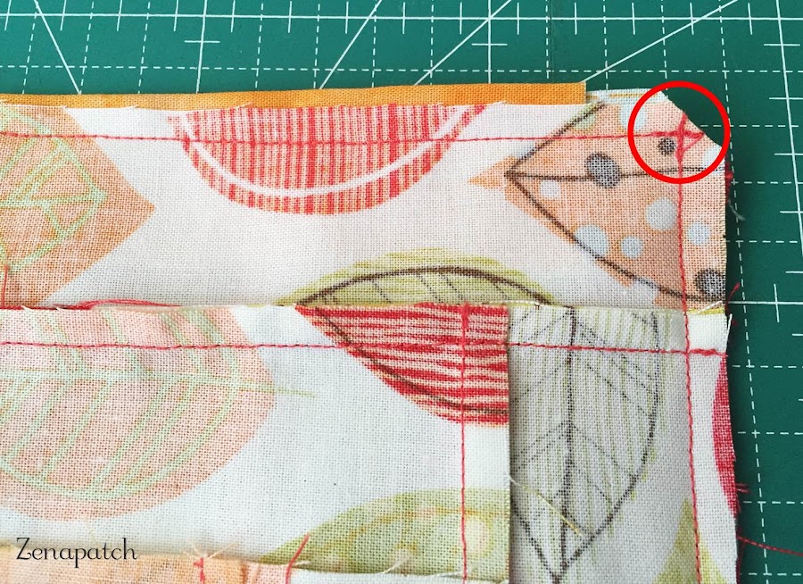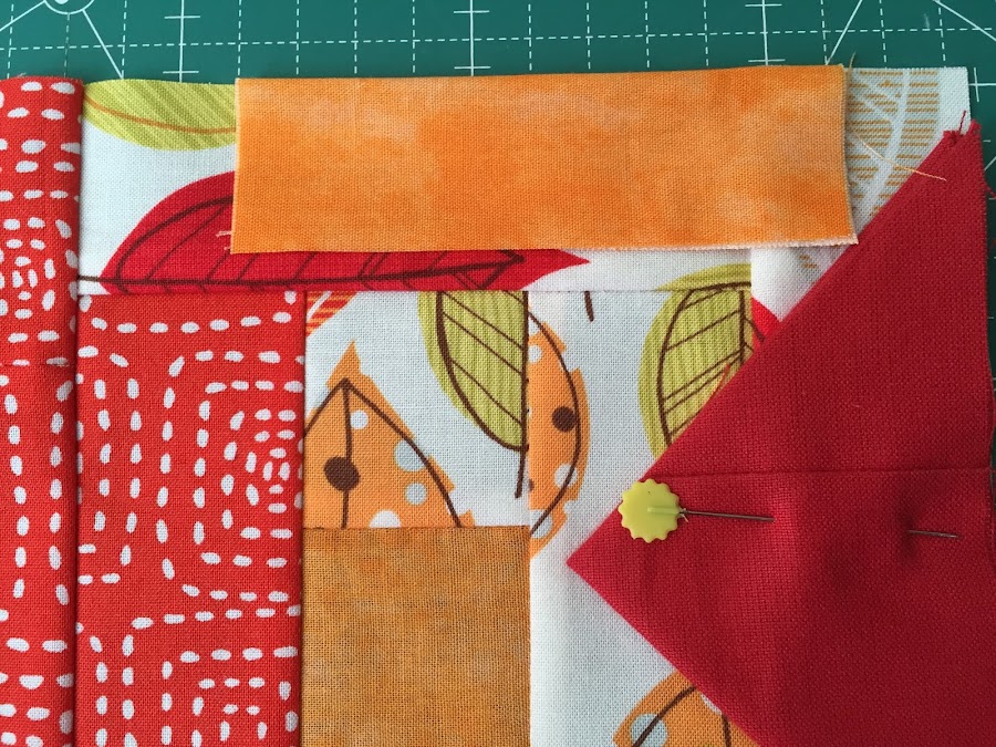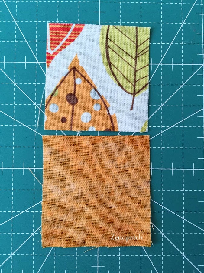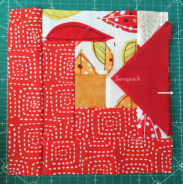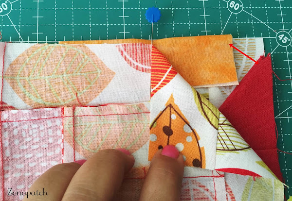 Toca coser a la derecha, 5 bloques de 5 - 2 cm (1 cm en la costura rojo-naranja y otro centímetro en la naranja-estampado) .. tenemos que cortar una tira de 13cm.