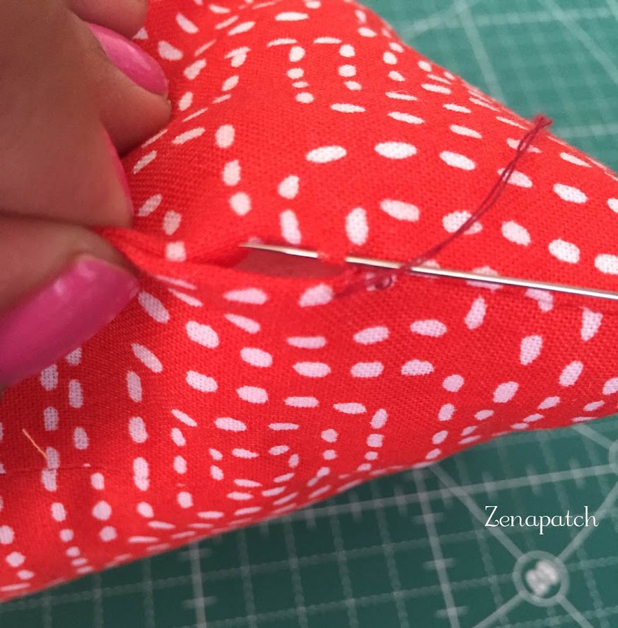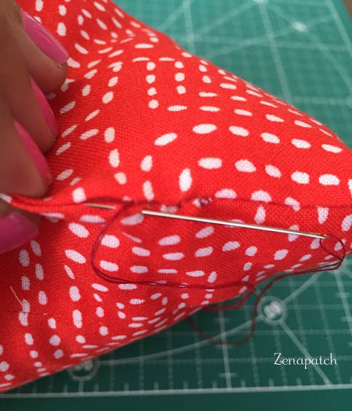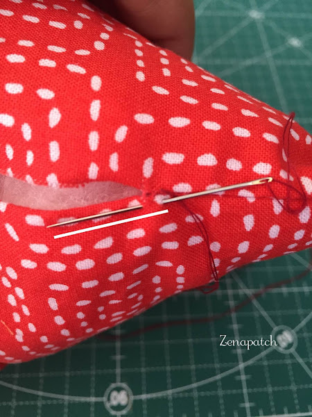 Cuando termines haz un nudo y saca la aguja por cualquier sitio lejos de la costura, tira un poco (se hundirá la zona de la costura) y corta el hilo, con lo que "el rabillo" quedará dentro del relleno