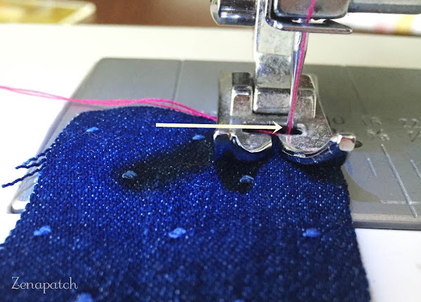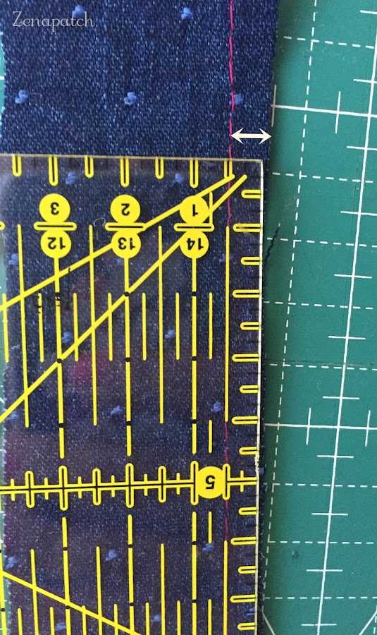En un retal o resto que tengas, lleva tu aguja hacia la derecha y cose unas puntadas. Mide hasta que consigas que tu costura sea de 0,5cm.