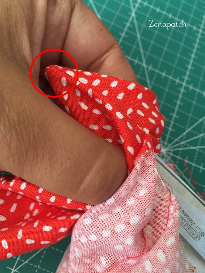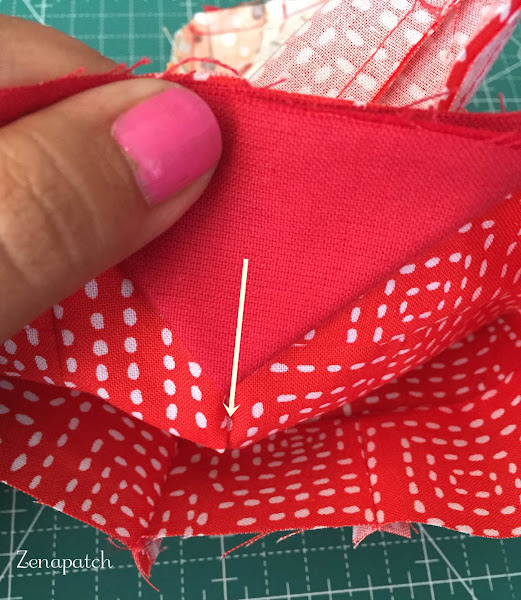 Así conseguimos un pico y dejamos los bordes cortados de la tela todos juntitos hacia la misma dirección.