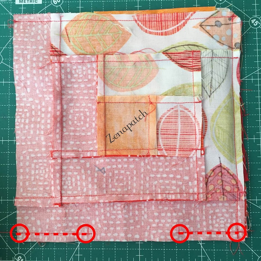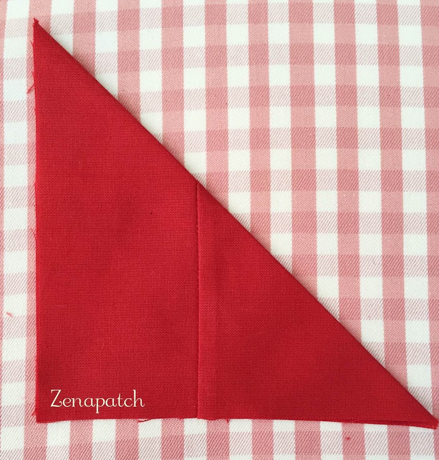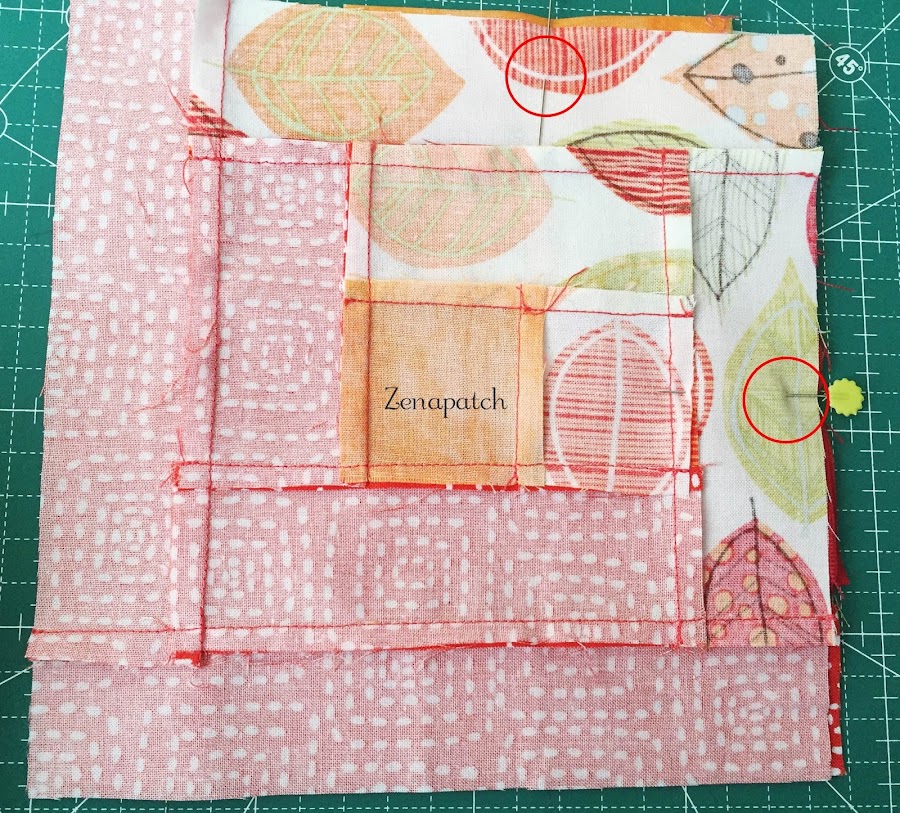 Partimos del mismo bloque central de 5x5cm. Lo colocamos sobre la tira de la tela A y cosemos. Ahora corta la parte que sobra de la tira. Asienta y plancha