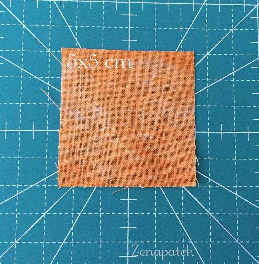 Corta otro cuadrado de la primera tela que quieras usar, de la misma medida que el que elijas para tu centro, en mi caso 5x5cm.