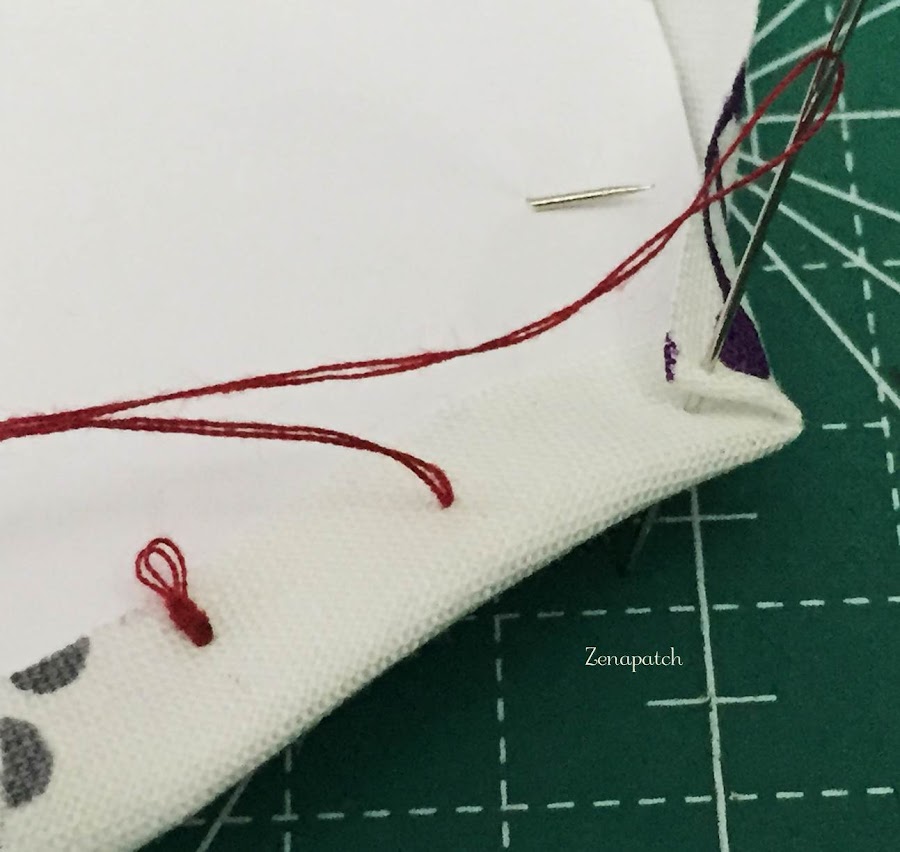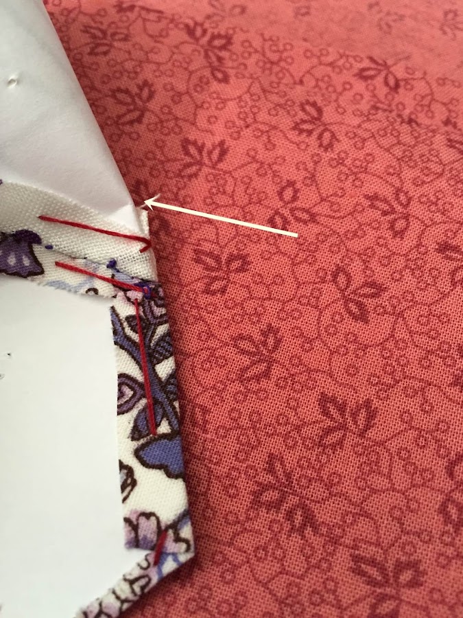 Clava la aguja sólo en la tela por la parte trasera, para dejar el nudo oculto, ten cuidado de no coger el papel con esta costura, y haz una costura invisible como te enseñé aquí al cerrar la gallina.