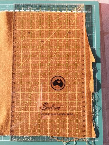 Ya tenemos nuestra tira de 10 cm de ancho, pero como ves, los lados siguen irregulares, así que tenemos que cuadrarlos. Para eso colocamos nuestra tira alineada con una de las marcas de nuestra base y cortamos un lateral, intentando que se desperdicie la menor tela posible. Cuando tengamos un lado listo, giramos la tira y hacemos coincidir ese borde bonito con la "marca 0", así nos quedará perfectamente rectangular. Ahora sólo nos queda repetir con el otro lado.