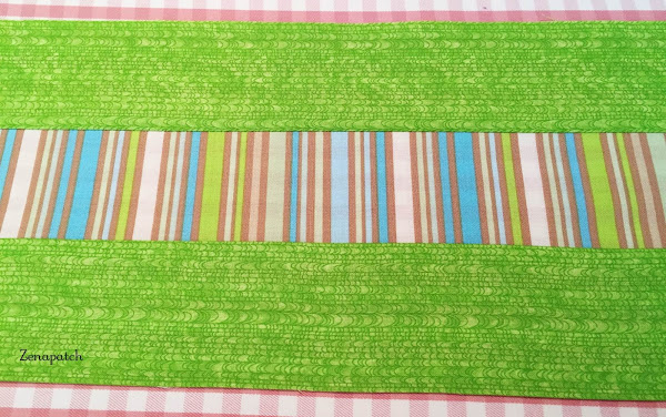 Cuando tengas tus dos primeras telas cosidas, coloca la del otro extremo sobre la tira central y cose.