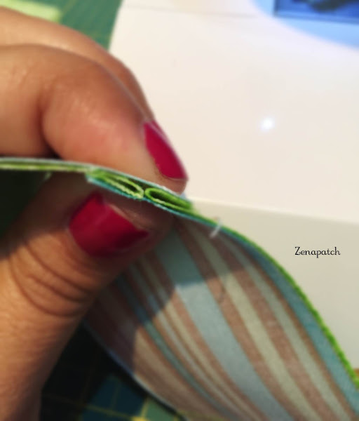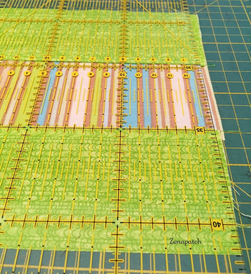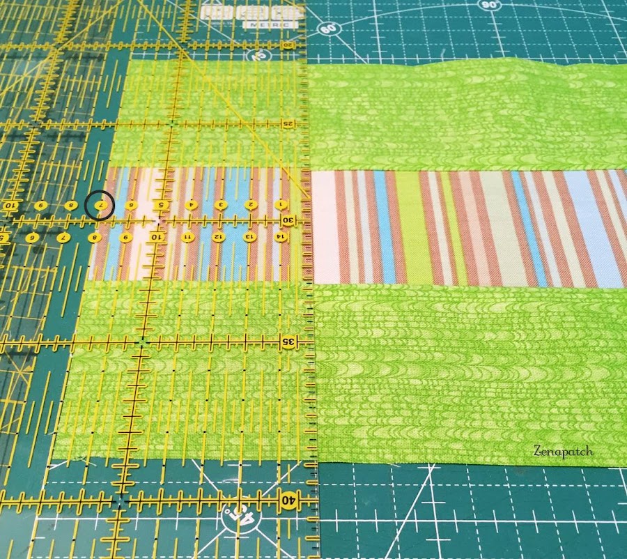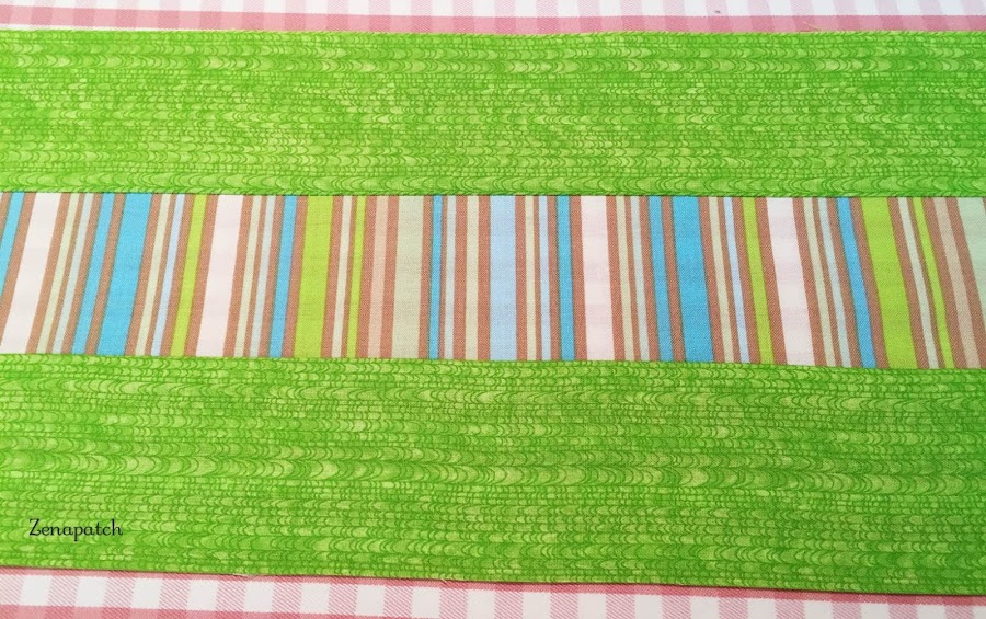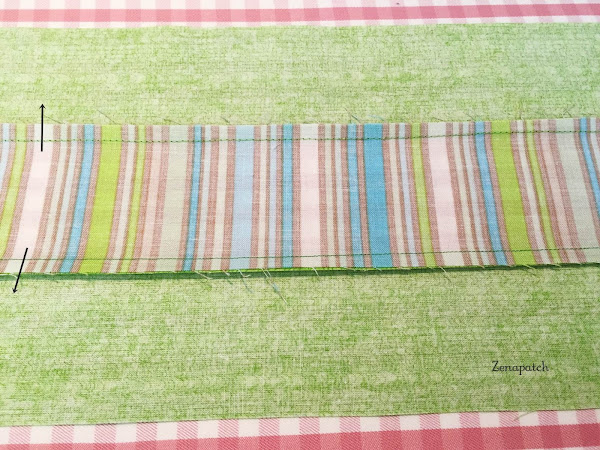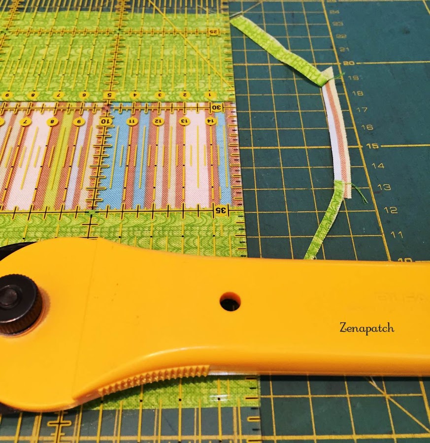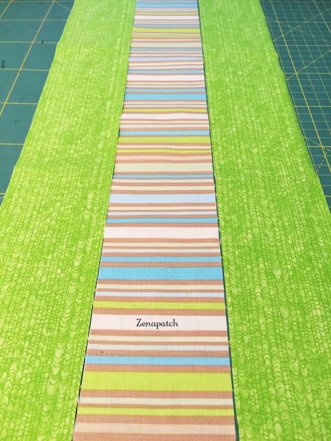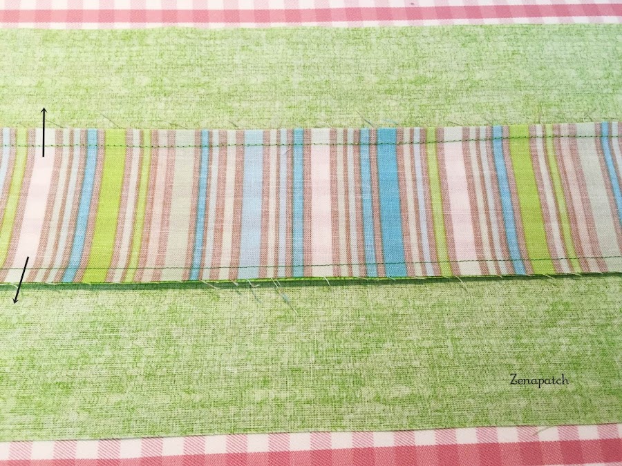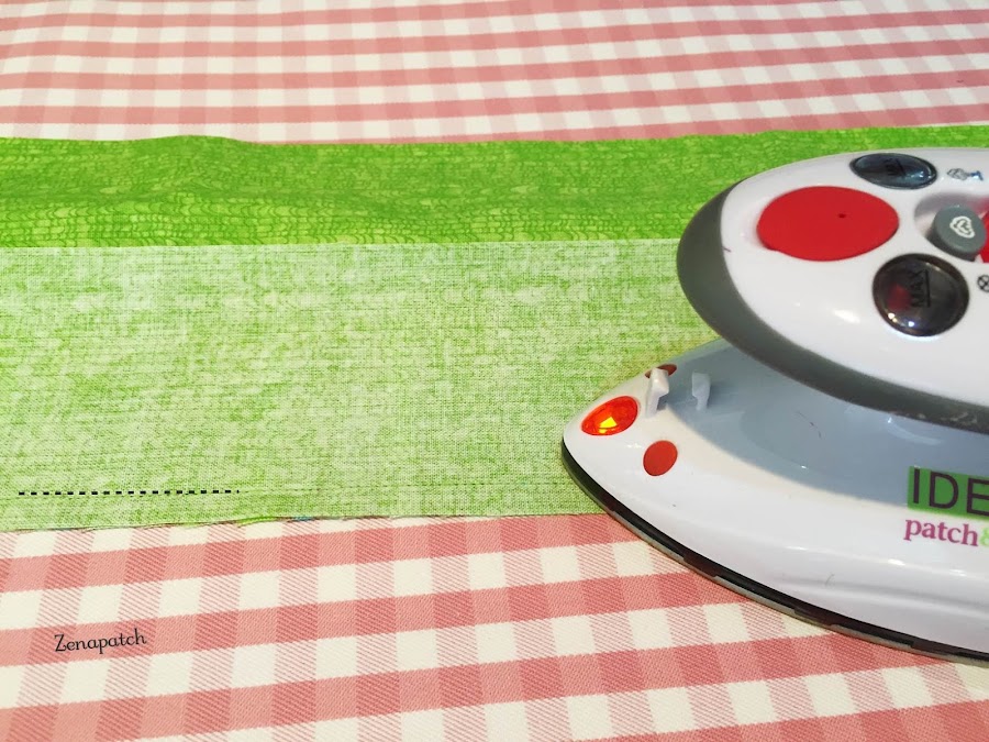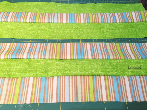 2- Segundo, si empezamos a coser nuestro primer par de tiras de arriba a abajo, cuando pongas tu tercera tira, empieza a coserlas desde abajo hacia arriba, y con eso conseguimos que la tela no "se abombe" en el centro ;)