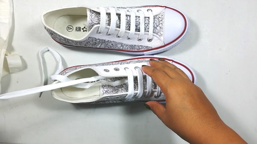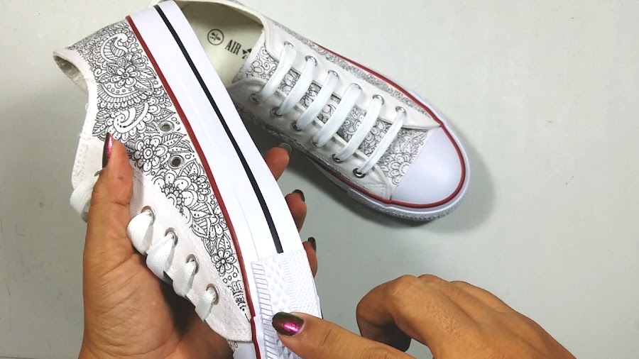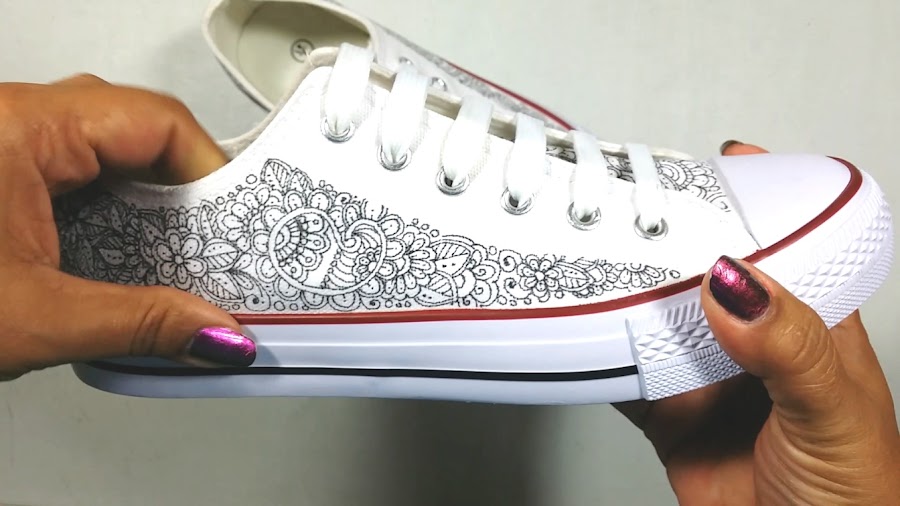 Comenzamos a dibujar directamente en la lona del zapato y continuamos hasta cubrirlo todo